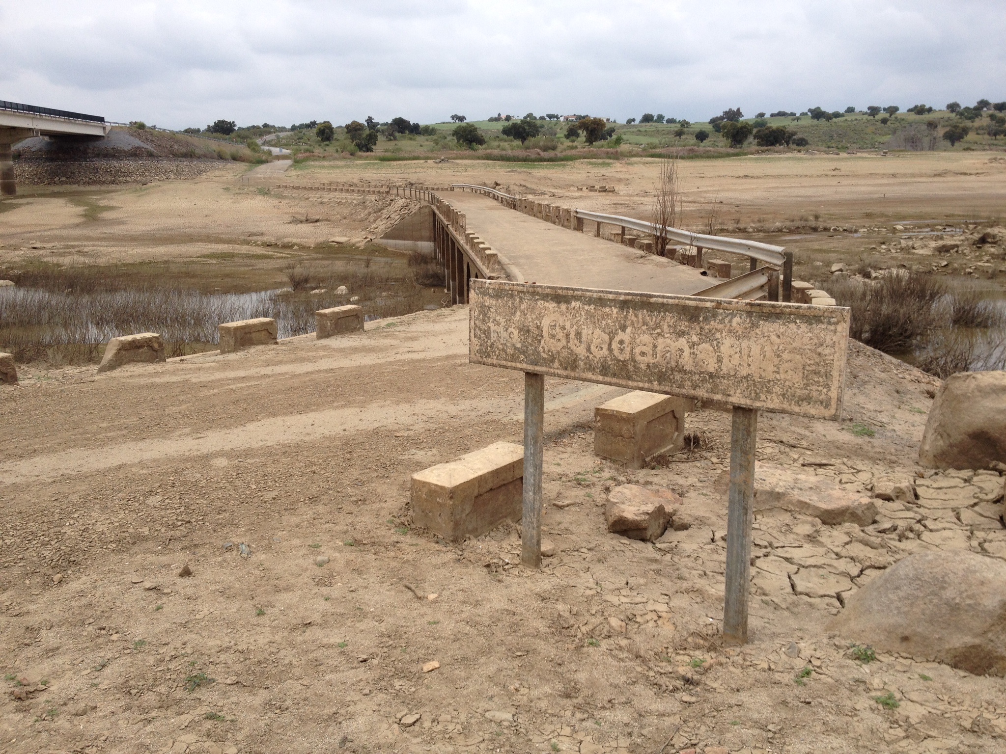 La presa de La Colada, en Los Pedroches, ha sido parcialmente vaciada para arreglar una especie de fisura. Eso, además de mostrarnos sus fondos, ha permitido dejar a la vista el viejo puente, su señalización y, con ello, el arte que encierra.