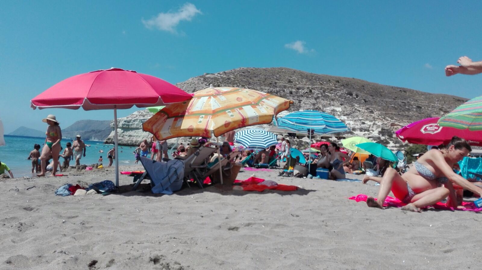 El escenario es una playa española. Es un día cualquiera del mes de julio y, a pesar de que esta es una zona aparentemente tranquila, la multitud ha copado los primeros metros de playa. Eso no es equiparable a decir «la playa estaba llena» pues se trataría de una exageración injusta. La playa llena es otra cosa, aunque he de decir que en este caso hay unos primeros metros, los más cercanos a la orilla, que están bastante saturados. La cercanía de los demás impide tomar una buena perspectiva del entorno. Estamos rodeados. De hecho, nosotros hemos rodeado igualmente a otros. En un simple vistazo a la fotografía que he tomado desde el punto bajo la sombrilla en el que me encuentro se percibe esa sensación de multitud: a la derecha la mujer embarazada que cambia de posición, arriba, su pareja, de la que solo vemos las manos y parte de los antebrazos justo en el momento en el que se extiende la crema solar, siguiendo hacia la izquierda y en un plano mucho más retirado apenas se puede distinguir gente y un carrito de bebé con una especie de mochila-conejo colgada de las asas del carro. Más a la izquierda se ve otra gente, mujeres principalmente, bajo sombrillas verde y amarilla. En un plano más próximo hay dos mujeres sentadas en una toalla de playa, junto a una pequeña nevera azul de playa, bajo una sombrilla a rayas marino, turquesa y blancas. Una de ellas aparenta ser más joven y otra aparenta ser mayor que esta. La aparentemente más joven parece sujetar un cigarrillo entre sus dedos y viste un bañador que juzgamos más pequeño del que llevó en días pasados pues se deja ver el contraste del sol en la piel. Un poco más a la izquierda destaca una sombrilla a rayas azul marino y blanca. Es tan típica como la nevera azul mencionada antes. Volviendo a un plano más cercano vemos una horrible sombrilla difícil de justificar, en la que predominan los tonos anaranjados, quizá ocre, con una extraña línea verde, algo parecido a rectángulos y triángulos blancos con botones y una especie de mancha de ketchup que se repite aleatoriamente. A la izquierda de la sombrilla roja camina una mujer que cubre su cabeza con una pamela. Tras ella unos niños juegan con la arena y un hombre con un bañador color crema camina junto a la orilla. Detrás se ven salientes, diríamos: tres cabos. Uno más lejano, otro intermedio y finalmente uno más cercano y diferente a los otros en color e, intuimos, en textura. Hay algunas personas bañándose en un atractivo mar de un color turquesa. Eso es, básicamente y a grandes rasgos lo que se ve desde este punto. Hacia arriba el cielo es azul y el sol golpea intensamente. Hacia abajo hay arena y bajo ella más arena, agujereada por miles de palos de sombrillas clavadas con más o menos ahínco. Pero esa foto no dice nada del hombre que acaba de salir del mar con los puntiagudos y cortantes fragmentos de lo que fue una litrona, hallada a tan solo unos centímetros del lugar por donde accede al mar un nutrido grupo de niños. El hombre se fotografía con ellos con ánimo de subir la imagen a las redes sociales para denunciar «que esto es la ciudad sin ley», al tiempo que protesta también por la inacción de la Policia Local ante la proliferación de botellones nocturnos en la playa durante estos días de fiesta en el pueblo. Y es que estamos de fiesta: hay verbena en la plaza, seguramente procesión marinera, actuación de la orquesta Cristal, banderitas y bombillas de luz blanca engalanando las calles, puesto de mojitos, venta ambulante, casetilla de escopetas, kebabs, hamburguesas, castillos hinchables, camas elásticas y tiovivo. Hay fiesta y, por la noche, a la luz de una luna roja y menguante, los jóvenes se buscan en la oscuridad del mar. En la foto no se oyen los ecos del reggaeton (he buscado en Google como escribirlo) de anoche, el de los coches tronando el baile del serrucho, si me das, pikipikipiki y otros éxitos de moda. Tampoco se percibe el olor a marihuana que hay, a esta hora de sol, en una playa llena de niños. Eso no quiere decir que los playistas fumen de forma generalizada sino que, como saben, el olor de ese tipo de hierba es intenso y generoso en permanencia. Un helicóptero de la Policia Local sobrevuela la playa y bordea la costa alejándose hacia el este. Un hombre grita a su hija: «La Patrulla Canina» y una mujer, francesa de Burdeos, me reconoce su temor a un atentado del Daesh tras lo ocurrido hace unos días en Niza. Ella no llevará a su hijo, de ocho años, a la sesión de fuegos artificiales que esa misma noche se lanzarán para el público asistente en esa misma playa. Su miedo es real. Detrás, diez hombres juegan la final de la Champions League en fútbol playa. Son jóvenes a excepción de tres de ellos, notablemente adultos, pero que persiguen demostrar su entereza física luciendo cuerpo y forzando carreras y marcajes. En la esquina, en el córner, cinco chicas adolescentes observan el partido alternando mirada al campo y mirada al móvil. Hay pocos móviles en la playa. Es decir, pocos en comparación con los móviles que hay en un concierto, o en un vagón de metro o en un pleno municipal. Tal vez sea que los móviles son caros y en esta playa, ni el calor, ni el riesgo de que sufran algún daño parecen descartados. Tampoco hay libros en la playa, al menos (como ocurre con los teléfonos móviles) veo pocos: ninguno conocido, las portadas me hacen sospechar que se trata de novelas de misterio, en el mejor de los casos policiacas. Imagino bajo las sombrillas algún poeta, por estadística debe haber al menos uno en esta playa. Quizá ese hombre que camina cargado (pequeña piscina hinchable, dos sombrillas, cubo, pala y rastrillo, mochila, silla de playa) y que a lo lejos se confunde con uno de esos vendedores de pareos. Ayer, a través de la ventana del apartamento, vi como uno de ellos organizaba sus montones. Sobre el césped de la urbanización extraía del plástico las coloridas telas, las d